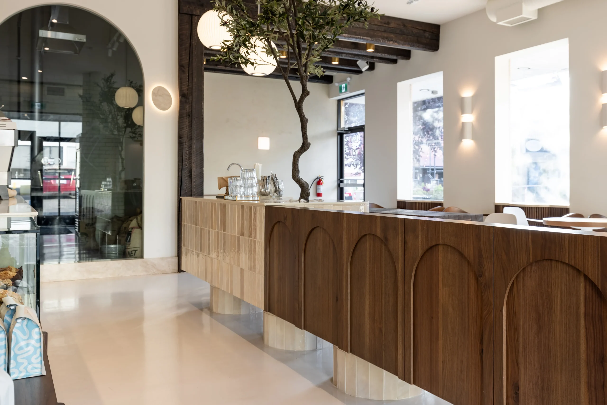 Modern kitchen featuring a dark wood custom island, white shaker cabinets, arched wood doors, and detailed millwork crafted by Hiebert Cabinets.