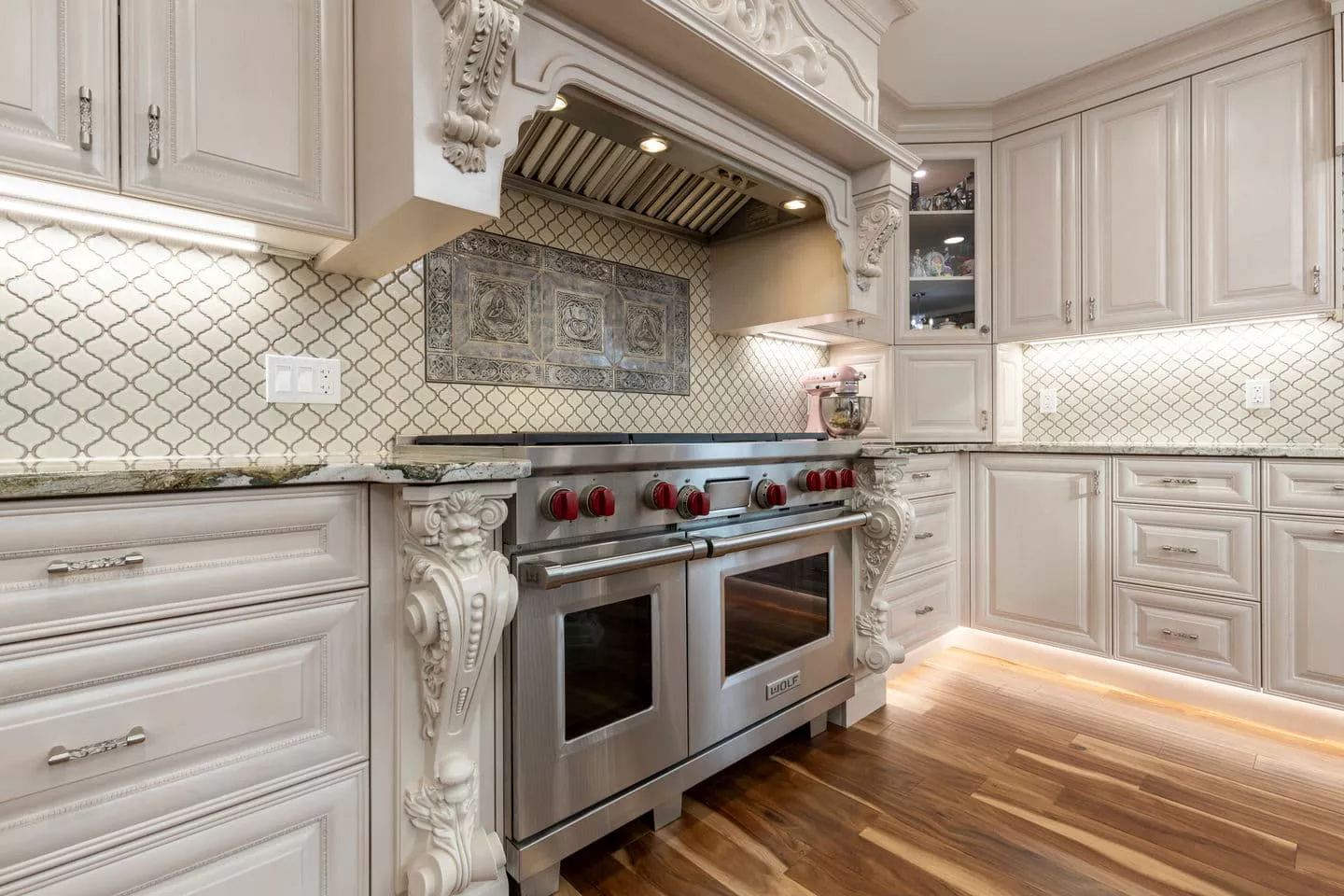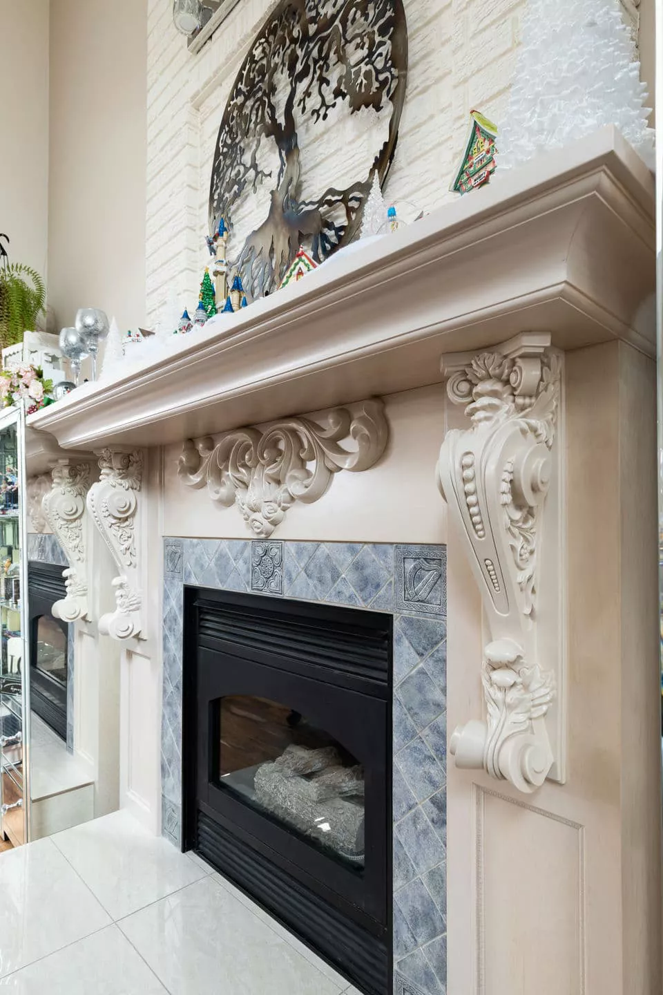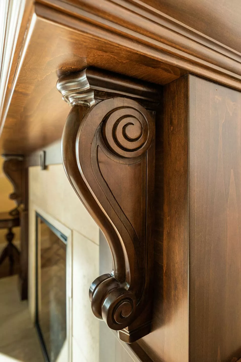 Ornate carvings, wood paneling, crown moldings and elaborate details create a sense of grandeur and elegance.